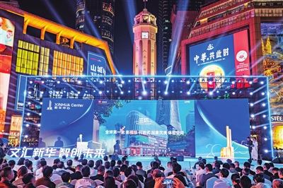 新华中心全球招商启动仪式及楼体灯光秀在解放碑步行街举行。 记者 王 欢 摄光影流转中,300米高的楼体仿若一本开合的巨大“书卷”,演绎“书中自有黄金屋”的文化意境……10月13日晚的重庆解放碑商圈华灯